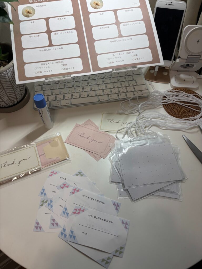 自分でデザインを作って名札と自己紹介カードを印刷して用意しました。